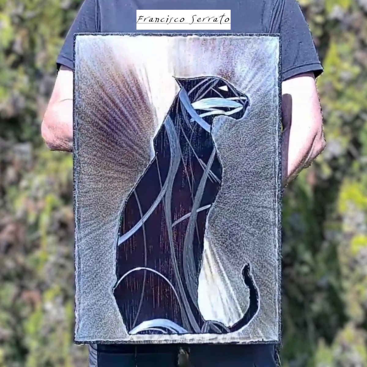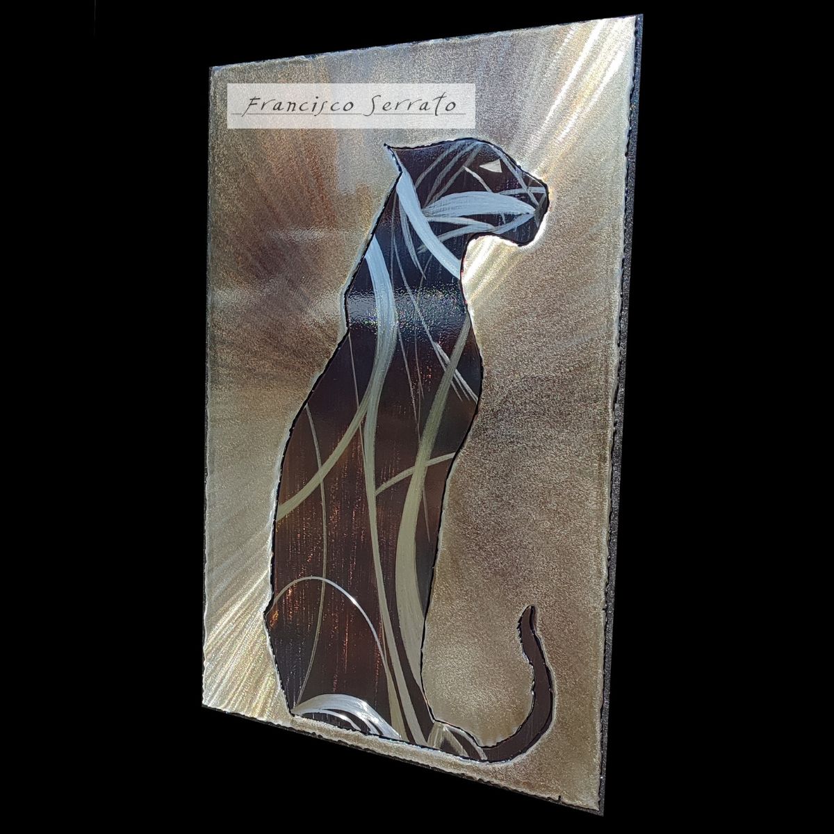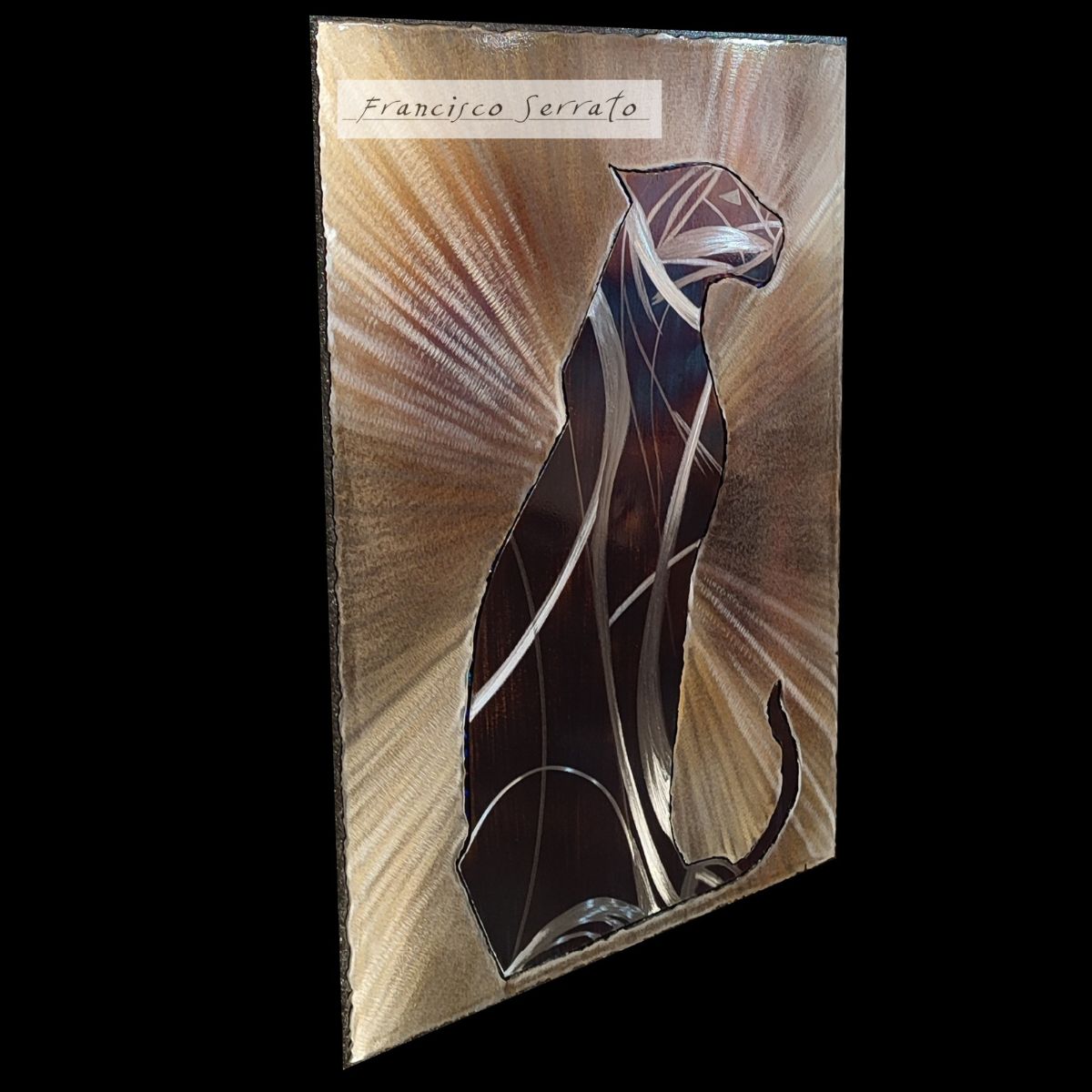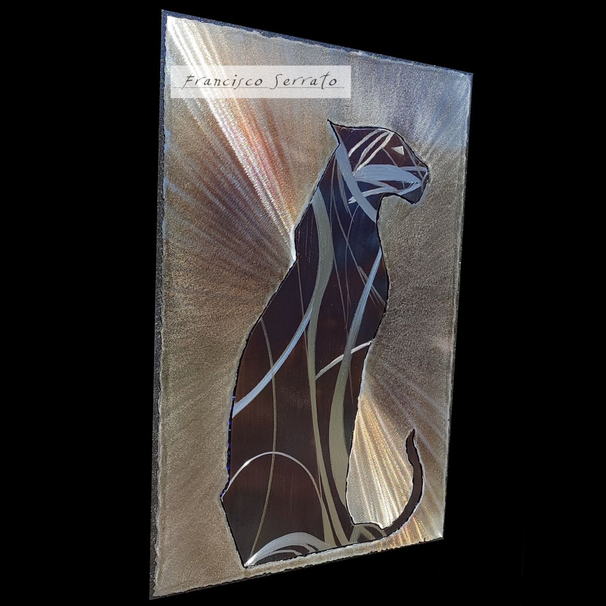 BAGHEERA, sous les reflets changeants de l’acier, Bagheera surgit comme un gardien mystique. Sa silhouette sombre, caressée de lumière, semble veiller entre deux mondes, félin sacré aux secrets insondables.