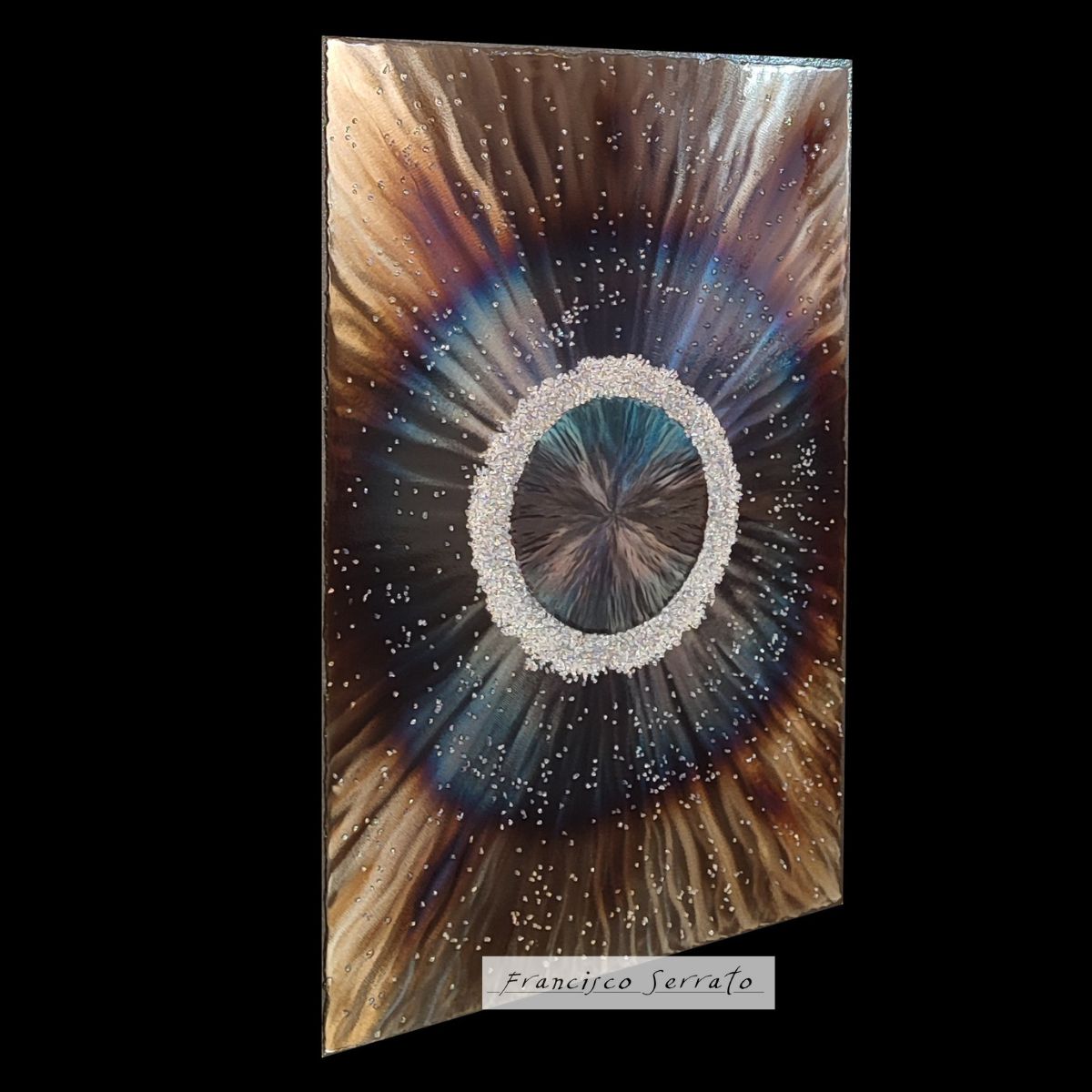 LUNYSFERE est une partition de lumière et de métal, où chaque cercle vibre comme une note suspendue dans l’éther. L’acier gravé devient une onde vivante, un vinyle cosmique tournant au rythme d’une mélodie silencieuse. Des filaments dorés s’entrelacent, tissant une harmonie secrète entre matière et lumière. L’œuvre respire, oscillant entre feu et éclats argentés, capturant l’instant où le son devient lumière.