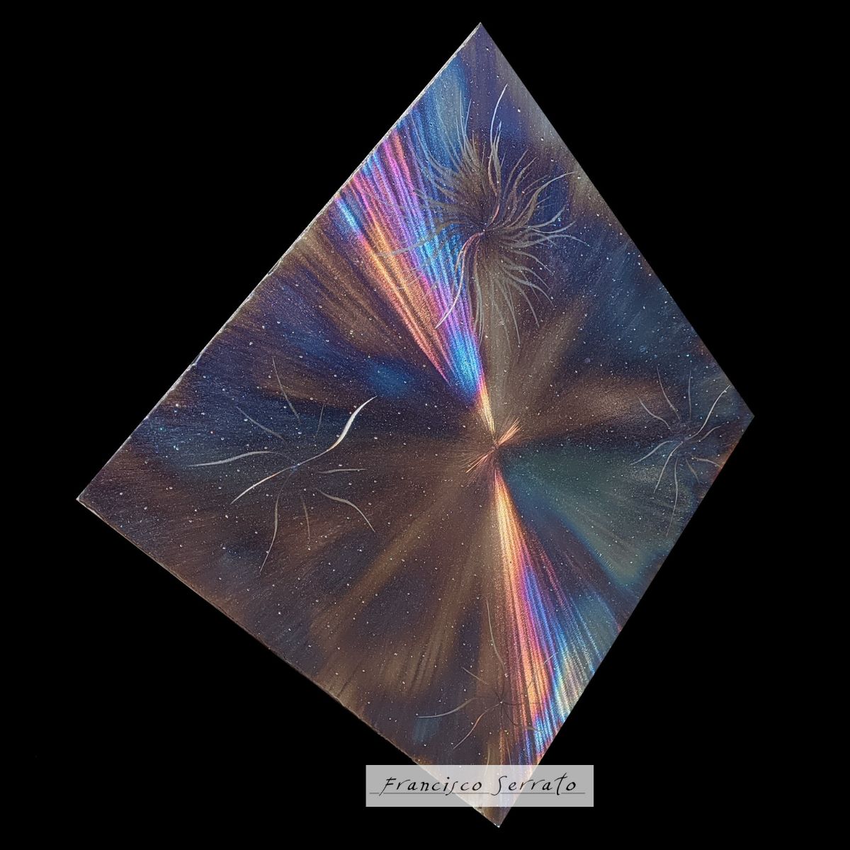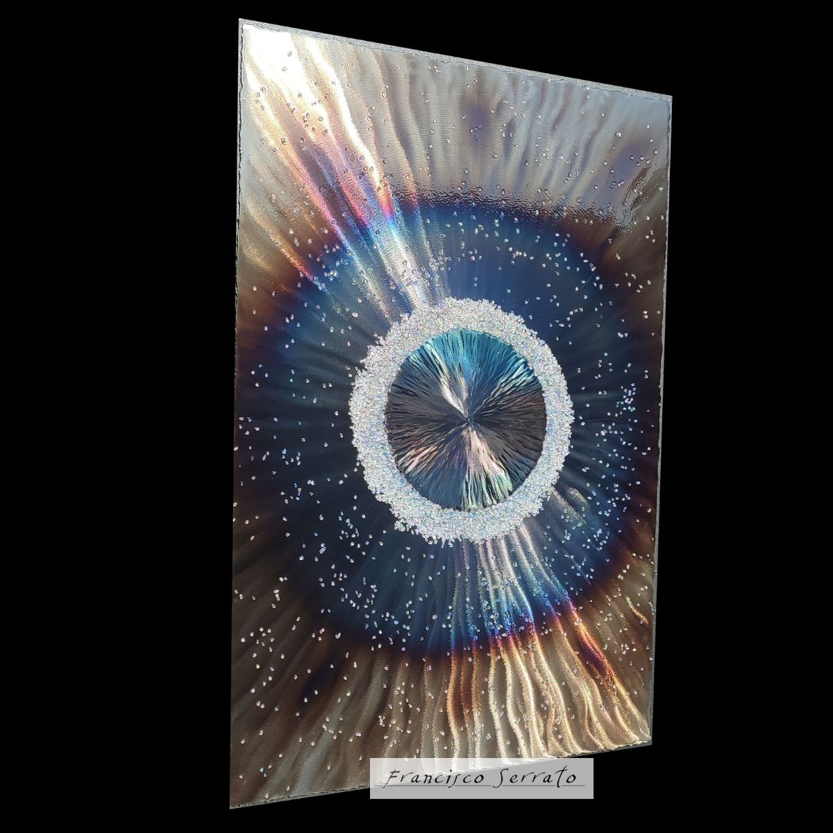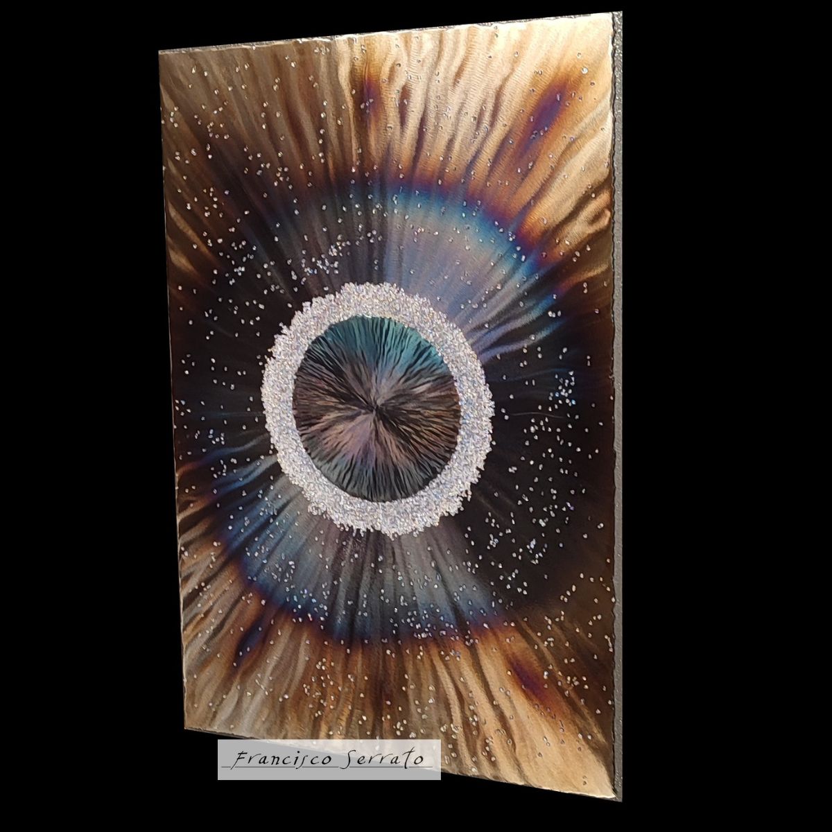 ISATYSS est une œuvre envoûtante qui invite à un voyage entre lumière et mystère. Des vagues de lumière se déploient sur l’acier, créant un ballet éthéré de nuances dorées et mauves. Au centre, un éclat intense attire le regard, tel le cœur battant d’une étoile lointaine, irradiant des filaments lumineux qui semblent tracer des chemins secrets.