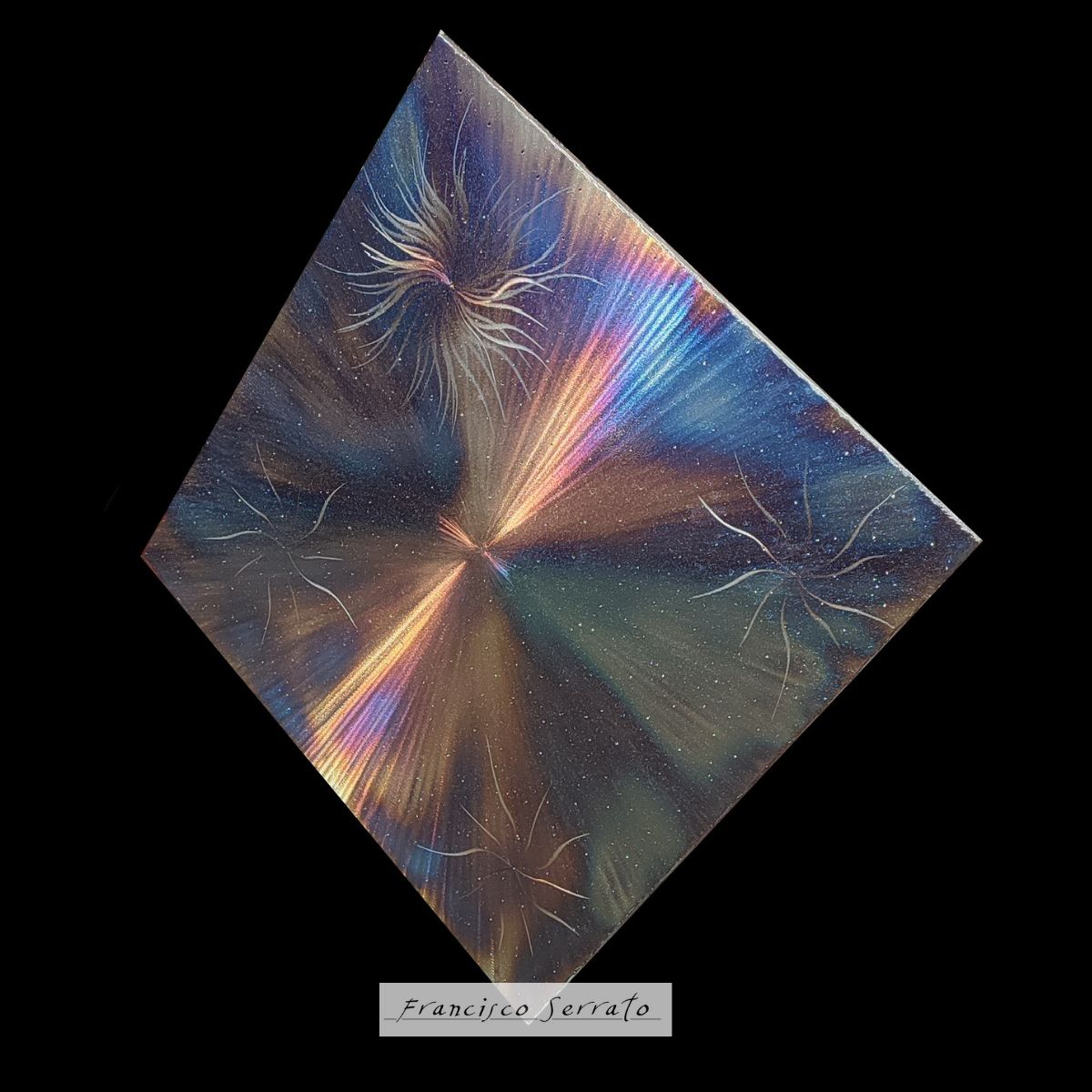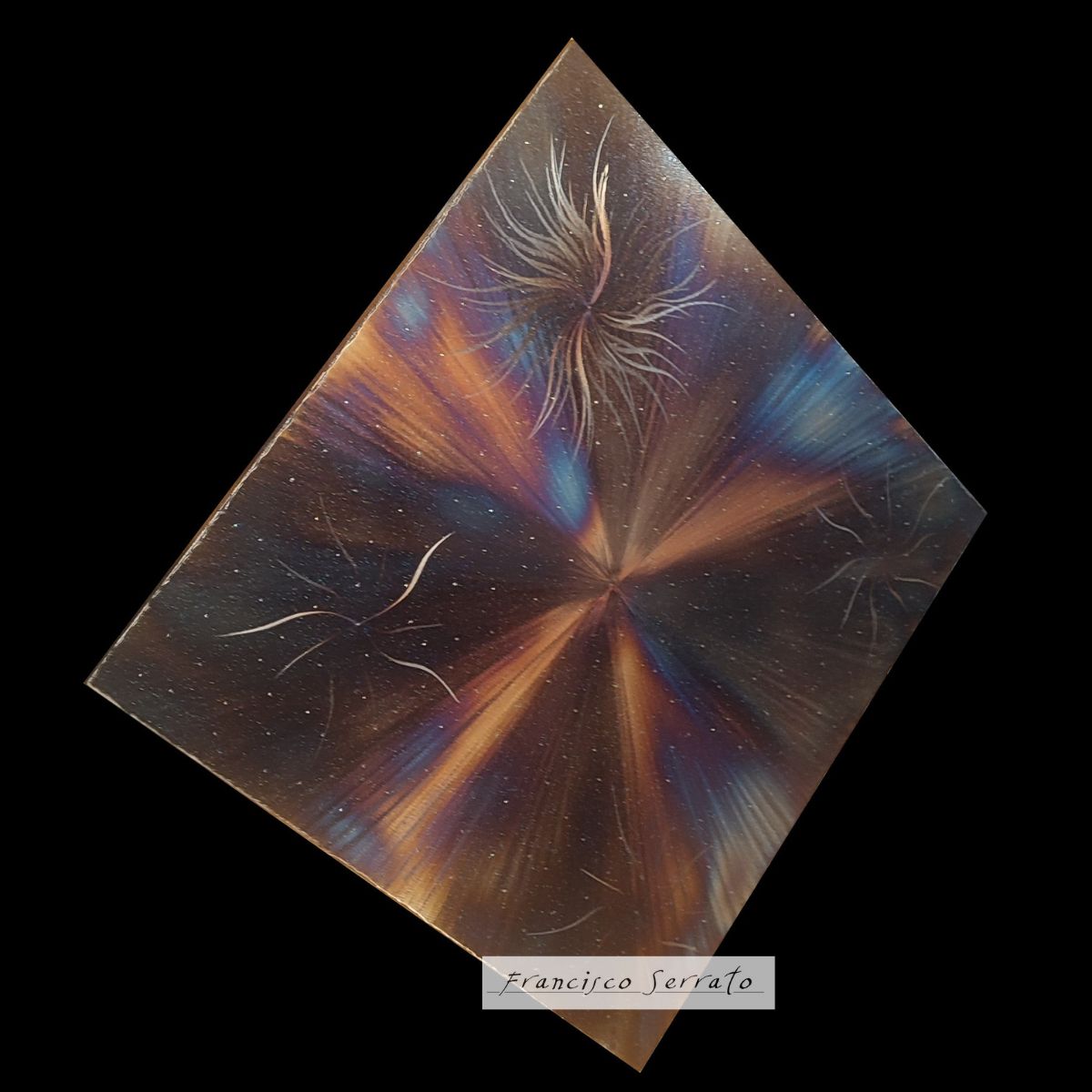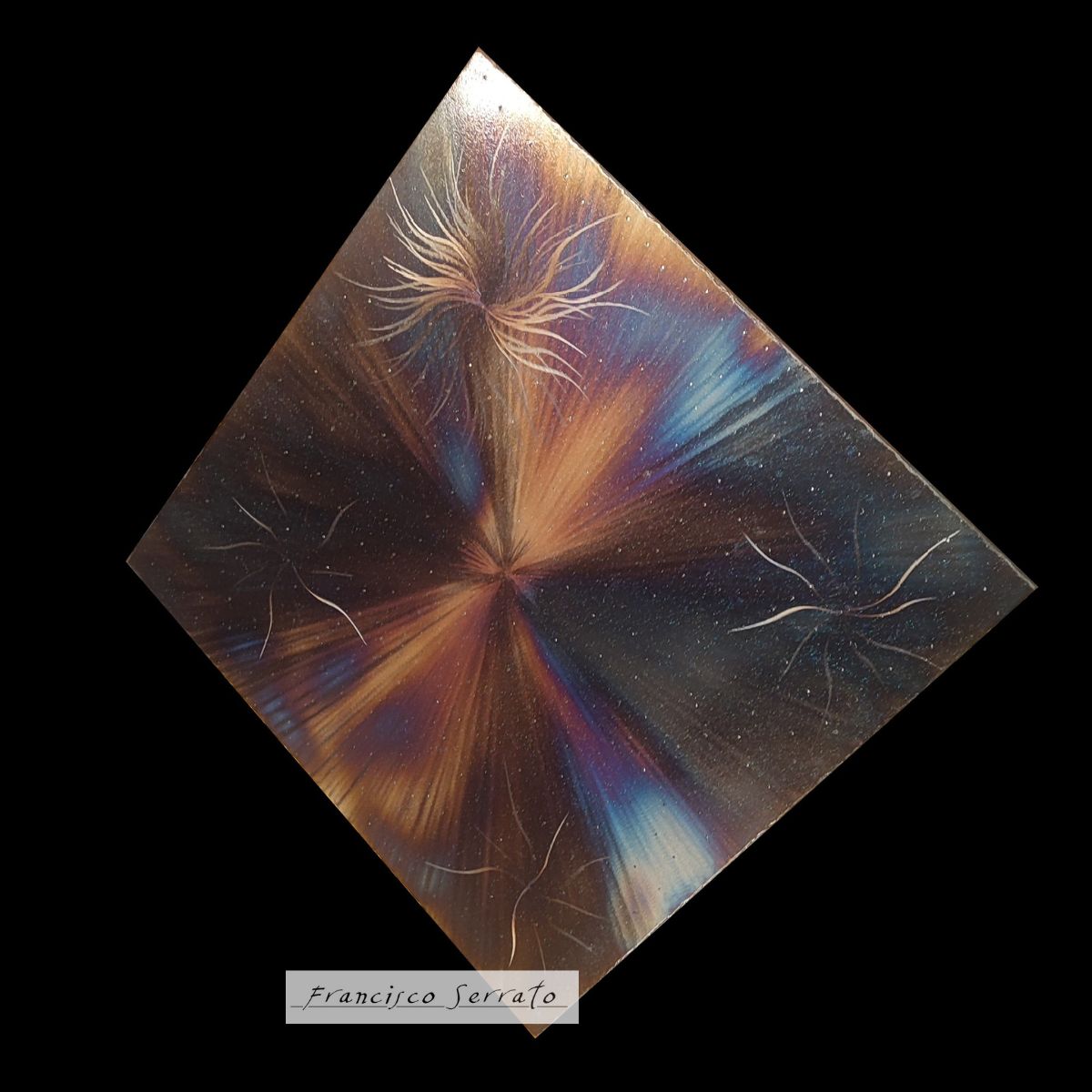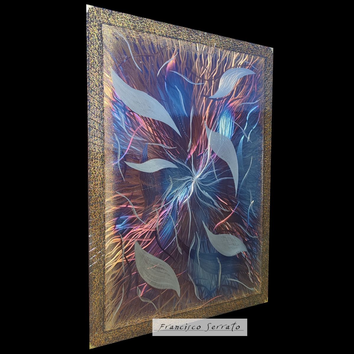 ISATYSS est une œuvre envoûtante qui invite à un voyage entre lumière et mystère. Des vagues de lumière se déploient sur l’acier, créant un ballet éthéré de nuances dorées et mauves. Au centre, un éclat intense attire le regard, tel le cœur battant d’une étoile lointaine, irradiant des filaments lumineux qui semblent tracer des chemins secrets.