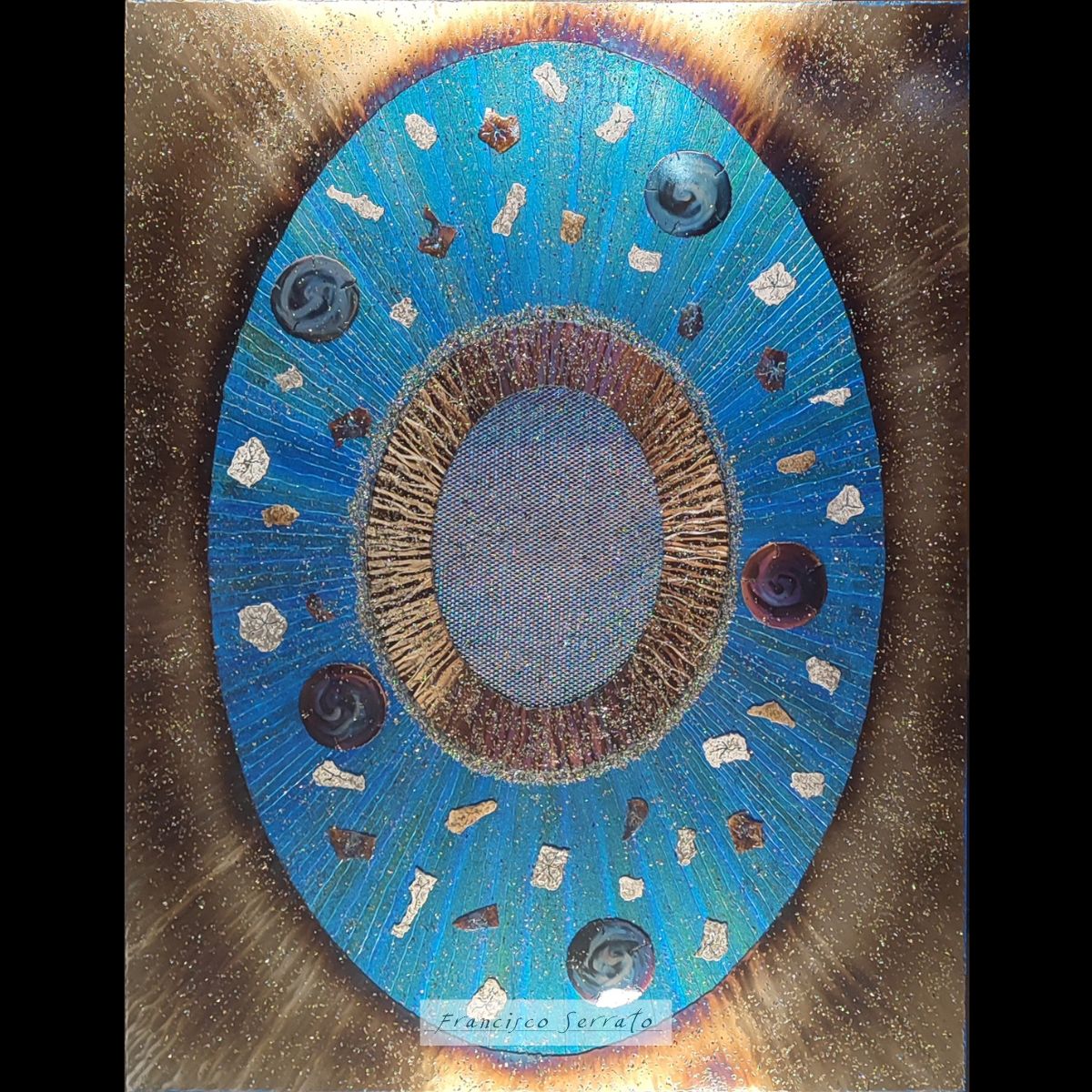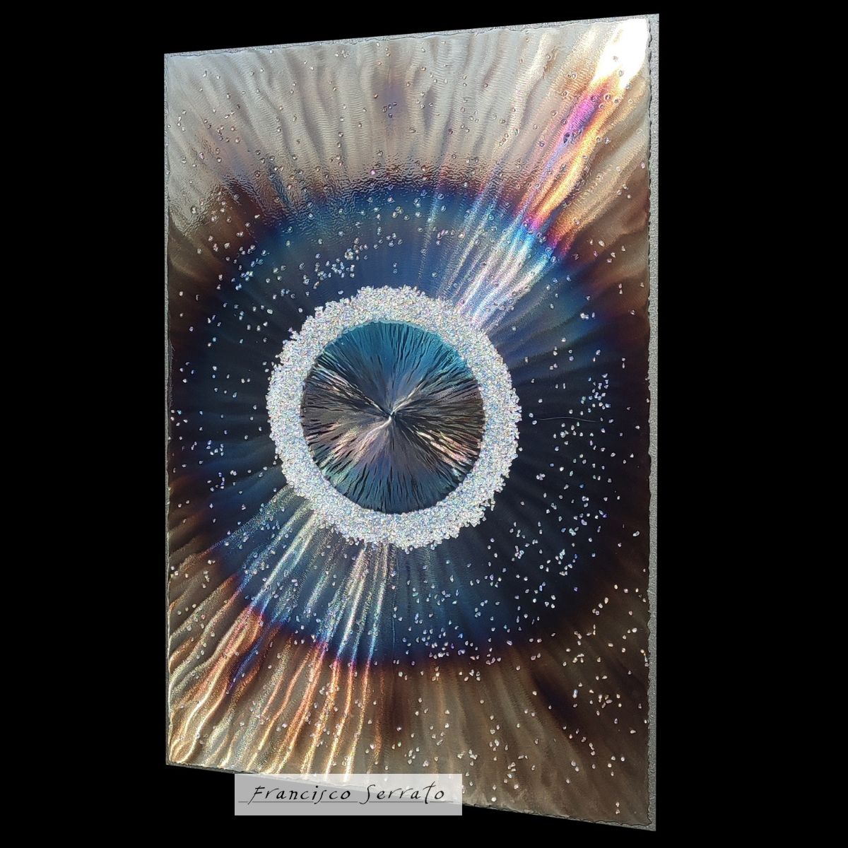 Tel un fragment de ciel tombé sur la terre, ASTREUS capte la lumière pour en révéler l’éclat mystique. Dans un halo d’azur parsemé d’éclats métalliques, l’œuvre évoque la naissance d’un astre, entre feu et matière. Chaque reflet semble respirer, chaque fragment briller d’une énergie cosmique, invitant le regard à voyager entre infini et émotion.