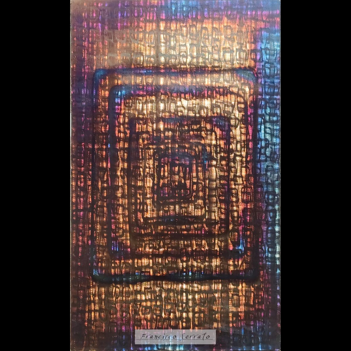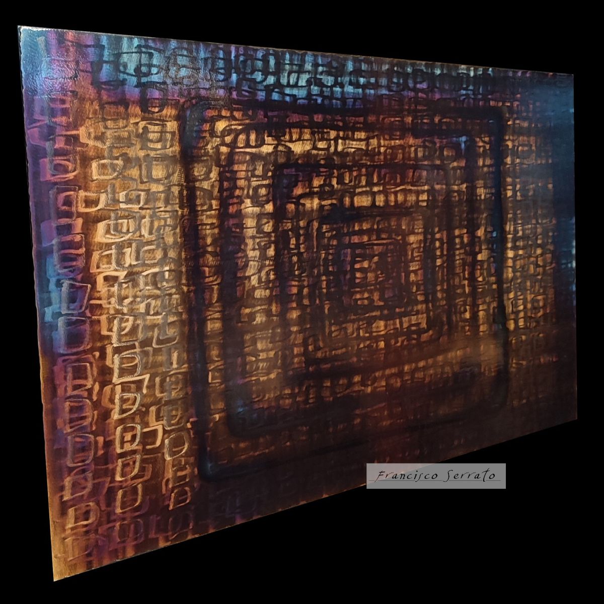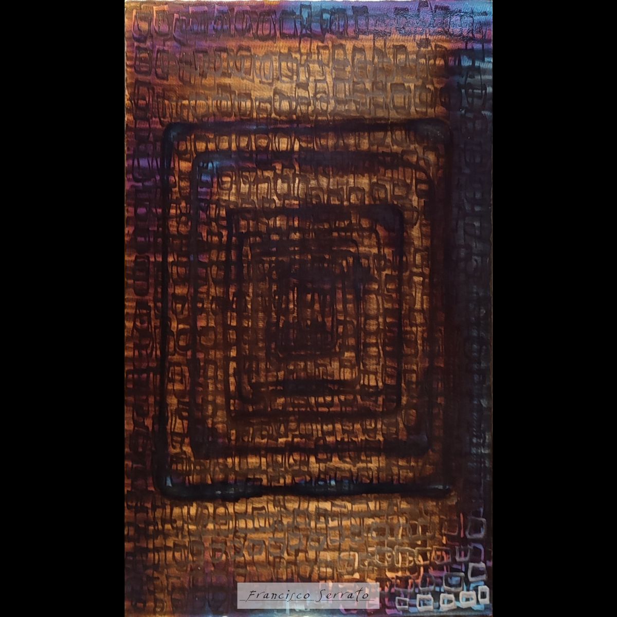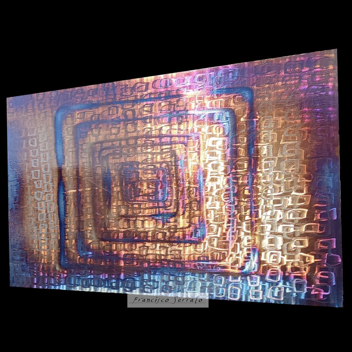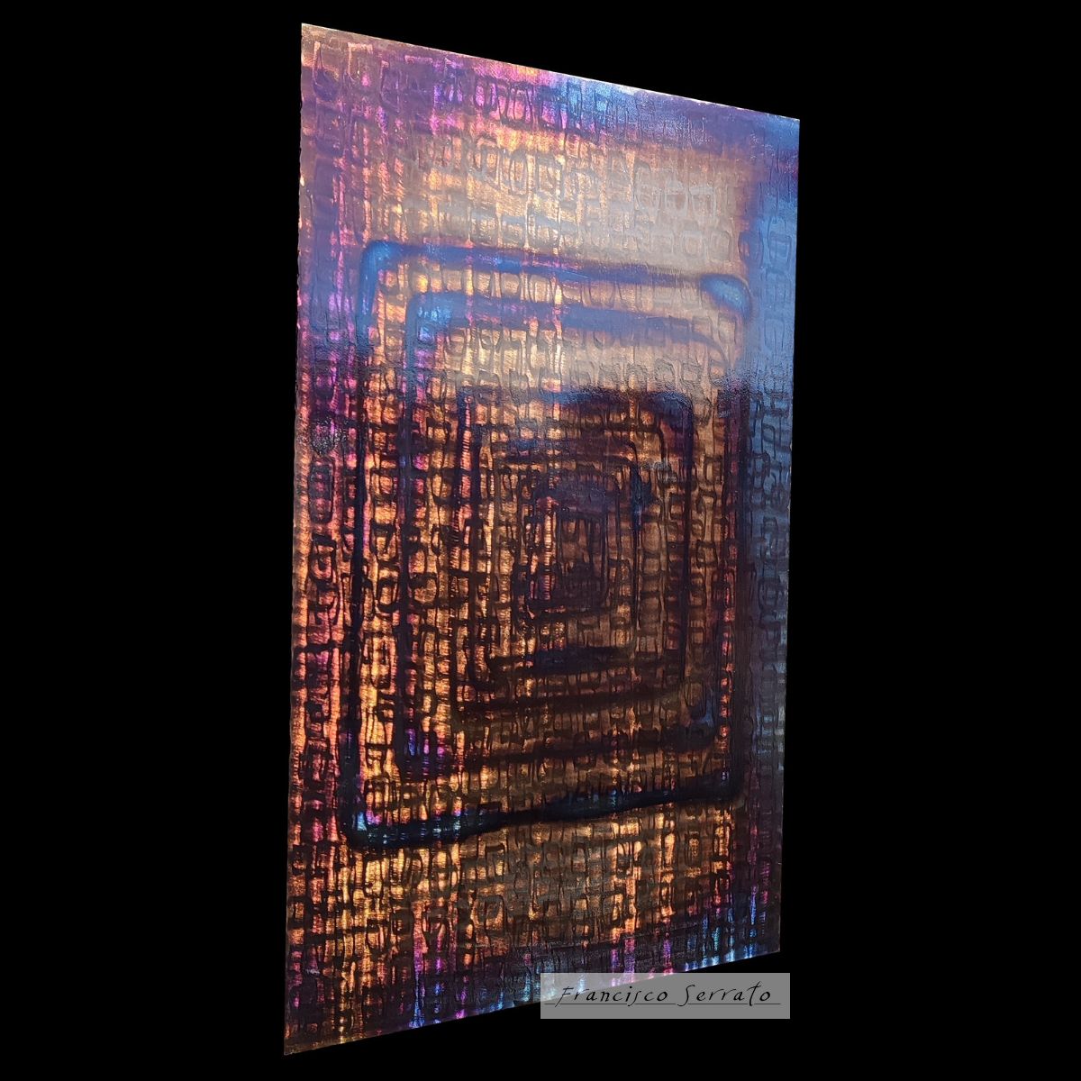 L’utilisation astucieuse d’une vieille structure en bois, offerte par mon maître formateur, rénovée avec passion, donne à cette œuvre une signification plus profonde. Réalisé avec une tôle d’acier perforée et une tôle pleine texturée, le tableau capte un effet de coucher de soleil changeant avec la lumière, accentuant son caractère vivant et renouvelé. Une véritable renaissance artistique, née de la fusion entre héritage et innovation.