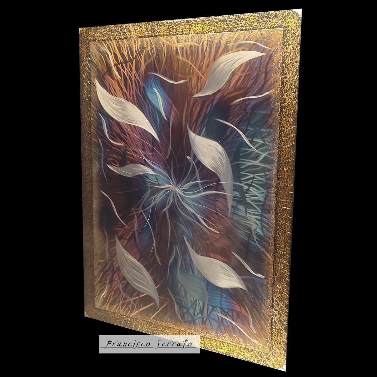 ECLAIREUM est une œuvre abstraite captivante où des éclairs jaillissent depuis un point central, évoquant un spectacle pyrotechnique. Les teintes dominantes, semblables à celles du feu, créent une atmosphère vibrante et dynamique. Avec ses nuances chaudes et ses mouvements fluides, ce tableau semble prendre vie et se métamorphoser au gré des changements lumineux, offrant ainsi une expérience visuelle en constante évolution.
